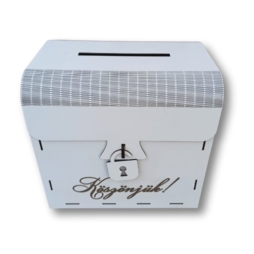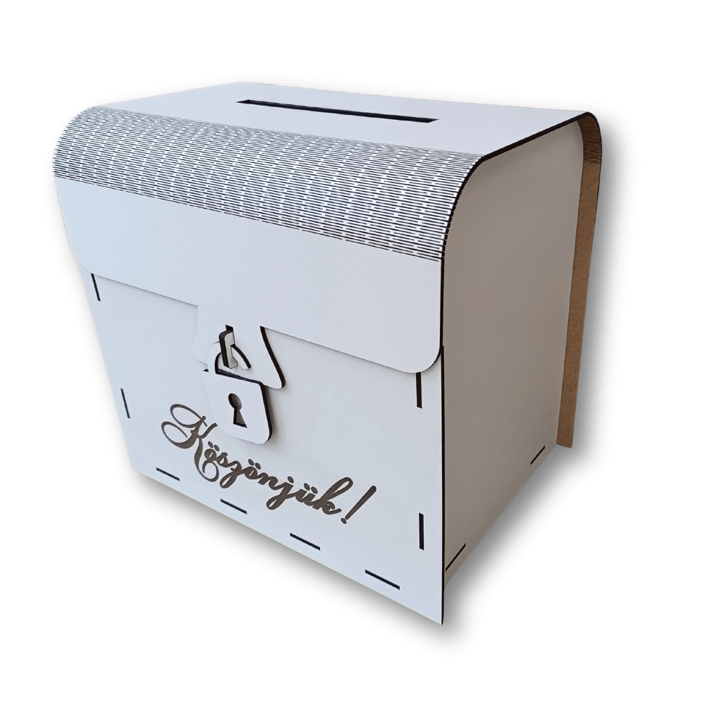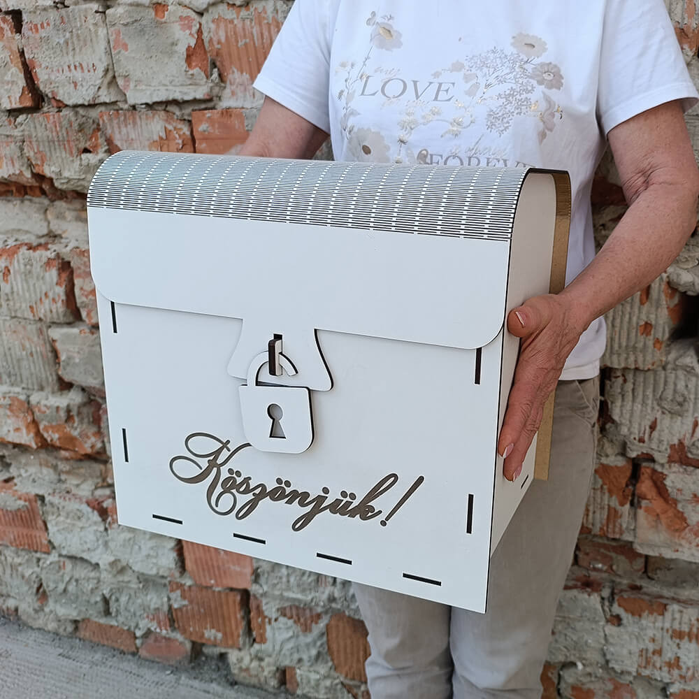 Elegáns és praktikus esküvői pénzgyűjtő láda, amely stílusos megoldást nyújt a nászajándékok gyűjtésére a nagy napon. Letisztult, fehér színének köszönhetően könnyedén illeszkedik bármilyen esküvői dekorációhoz – klasszikus, romantikus vagy modern stílushoz egyaránt.