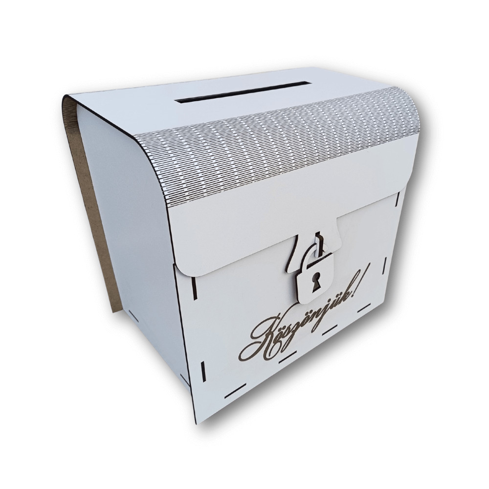 Ez a fehér esküvői pénzgyűjtő doboz praktikus és dekoratív kiegészítő, amely méltó része az esküvői asztaldísznek, és segít rendszerezetten összegyűjteni a vendégek ajándékait.